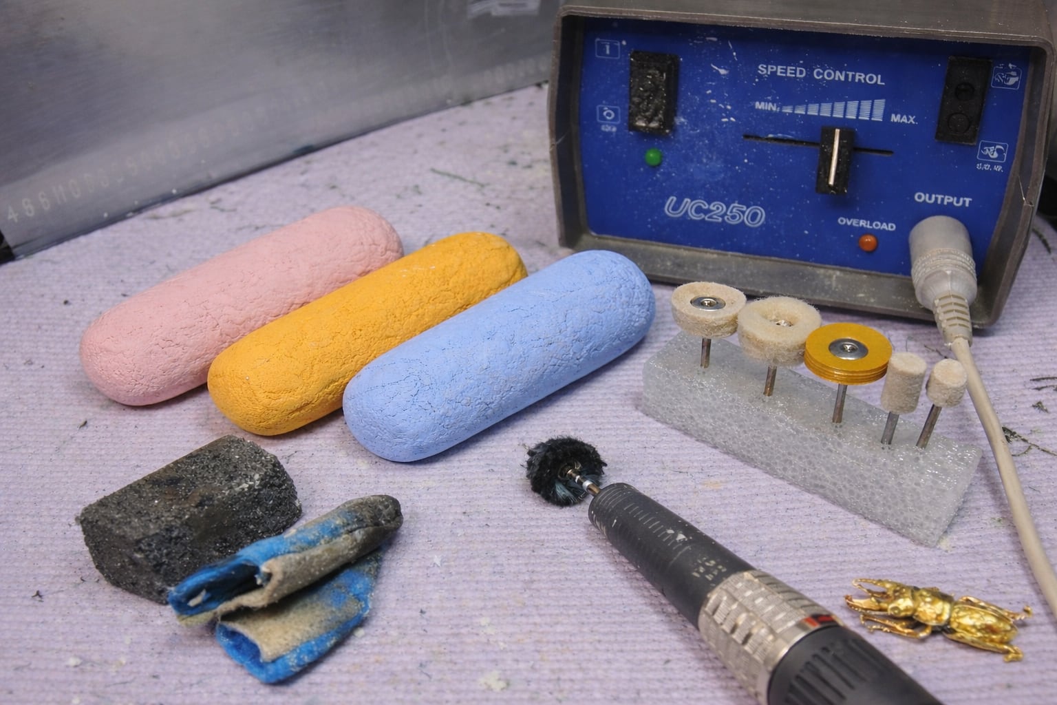 手磨き用のスポンジ類やクロス、ルーター用のバフや補助器具も気軽に始められる様に、少量~取り扱っています。